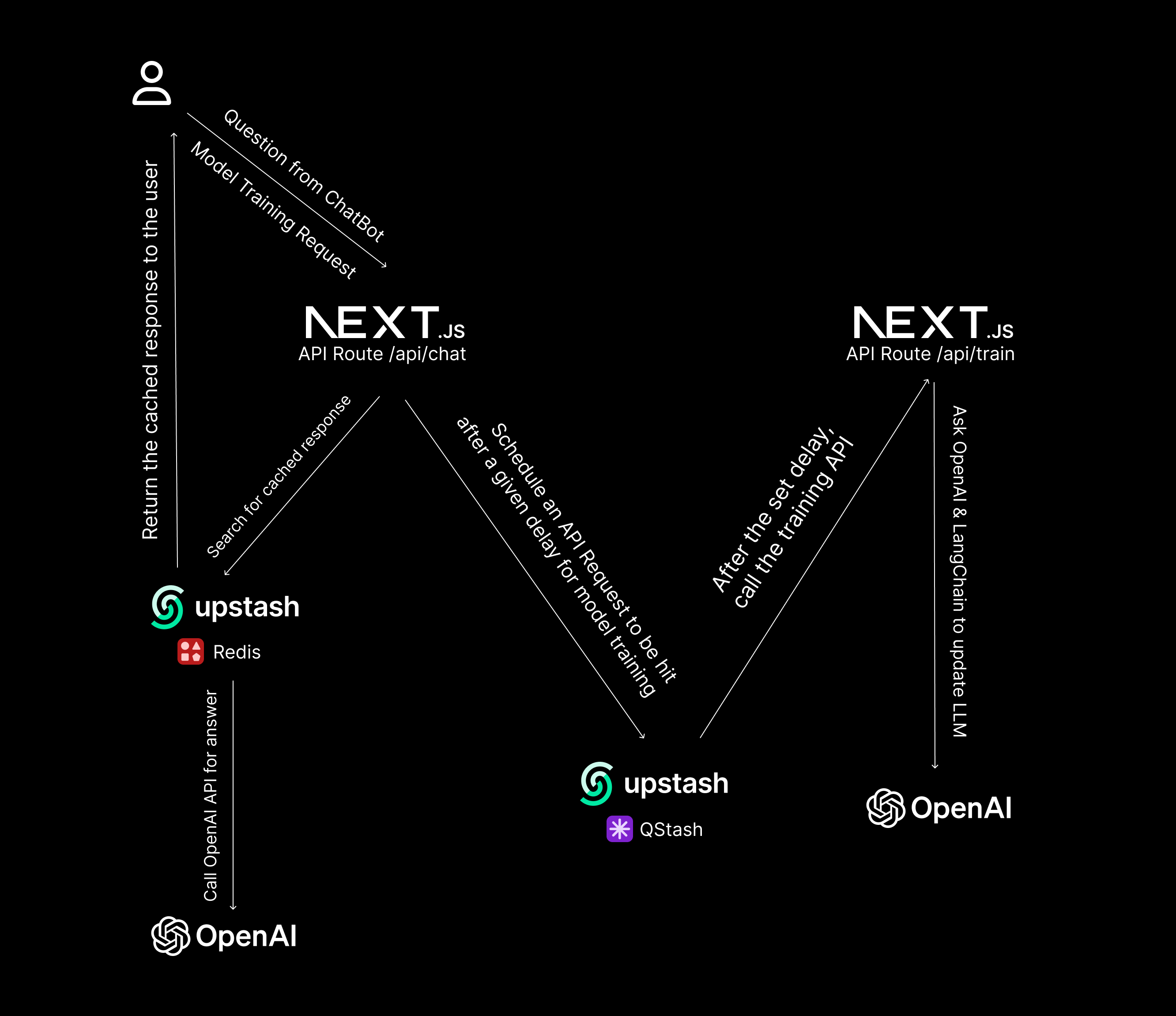 • When a user asks a question via the chatbot, users’ IP is checked against rate limiting, and a response, if not cached via Upstash Redis, is sought from OpenAI API (then cached) and streamed to the user
