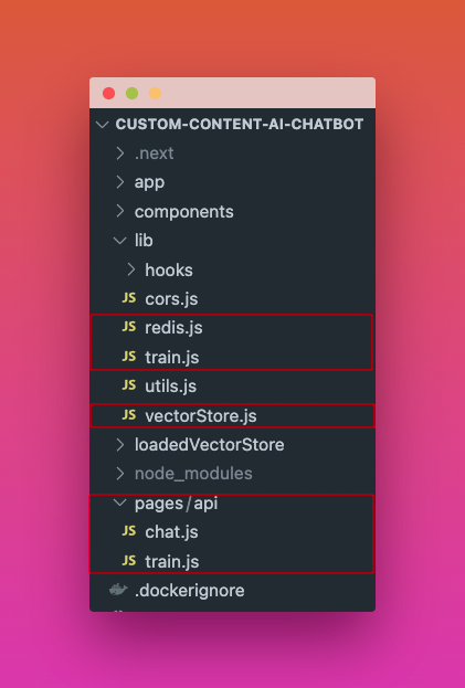 This is the main folder structure for the project. I have marked in red the files that will be discussed further in this post that deals with managing the vector store, creating API Routes for chatting with AI trained on your custom content (with caching the responses), and scheduling model training process.