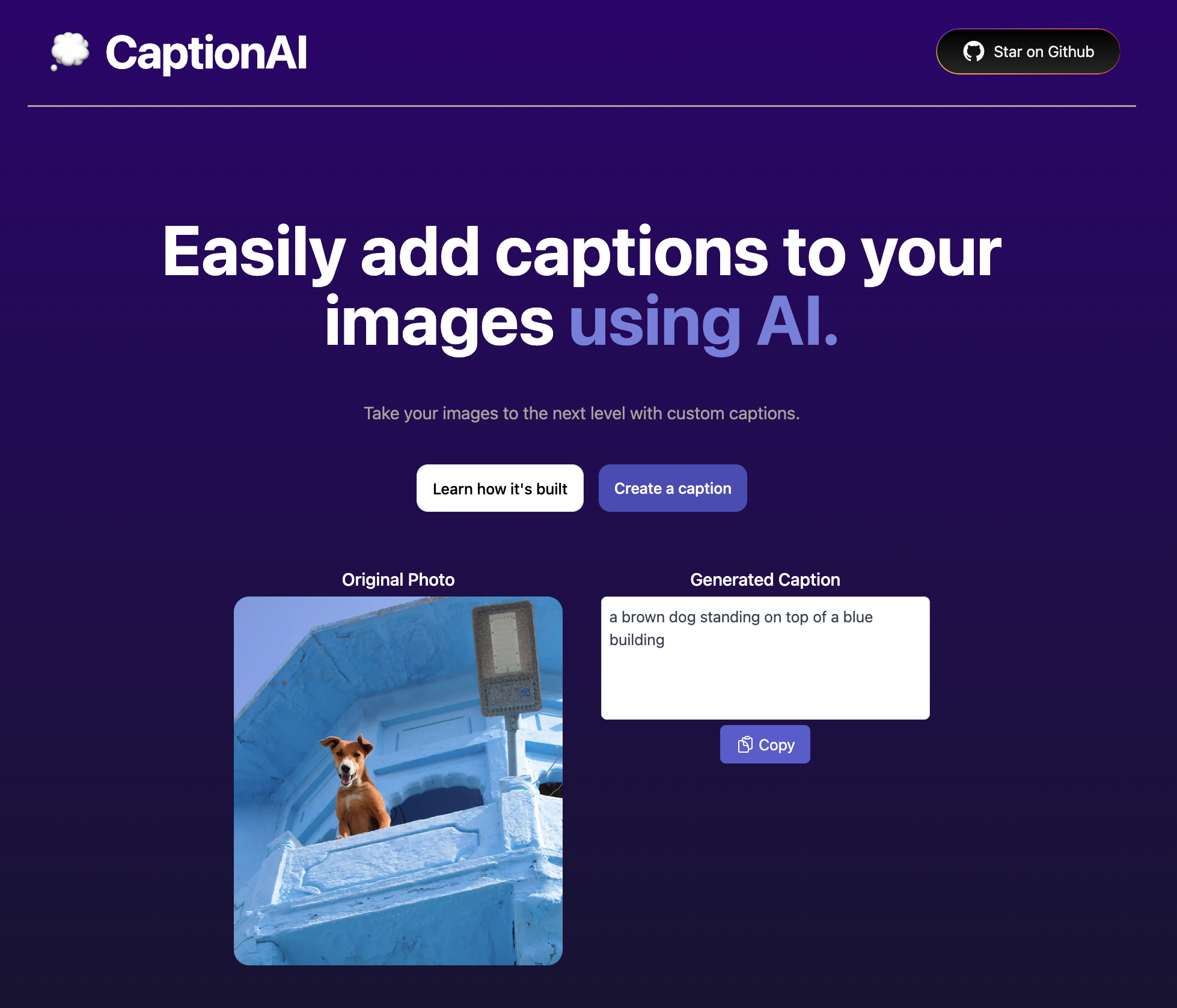 originalPhotois a string that represents the URL of the uploaded image.captionis a string that contains the generated caption for the uploaded image.buttonTextis a string that represents the text on the copy button.loadingis a boolean that indicates whether the component is currently fetching data.erroris a string that contains the error message if there is an error during the caption generation process.