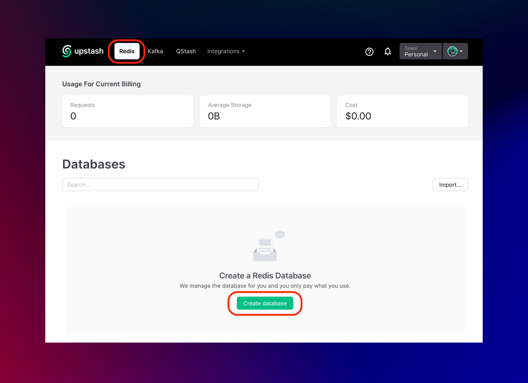 Once you have created an Upstash account and are logged in you are going to go to the Redis tab and create a database.