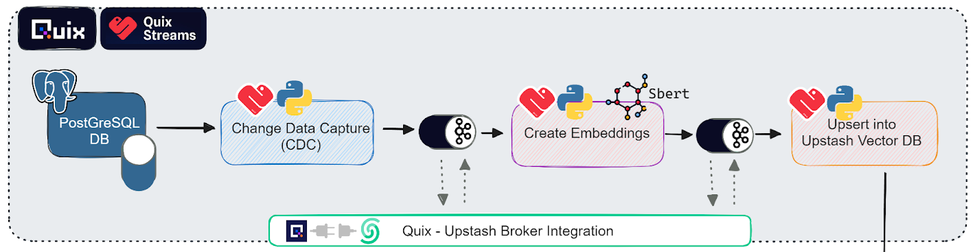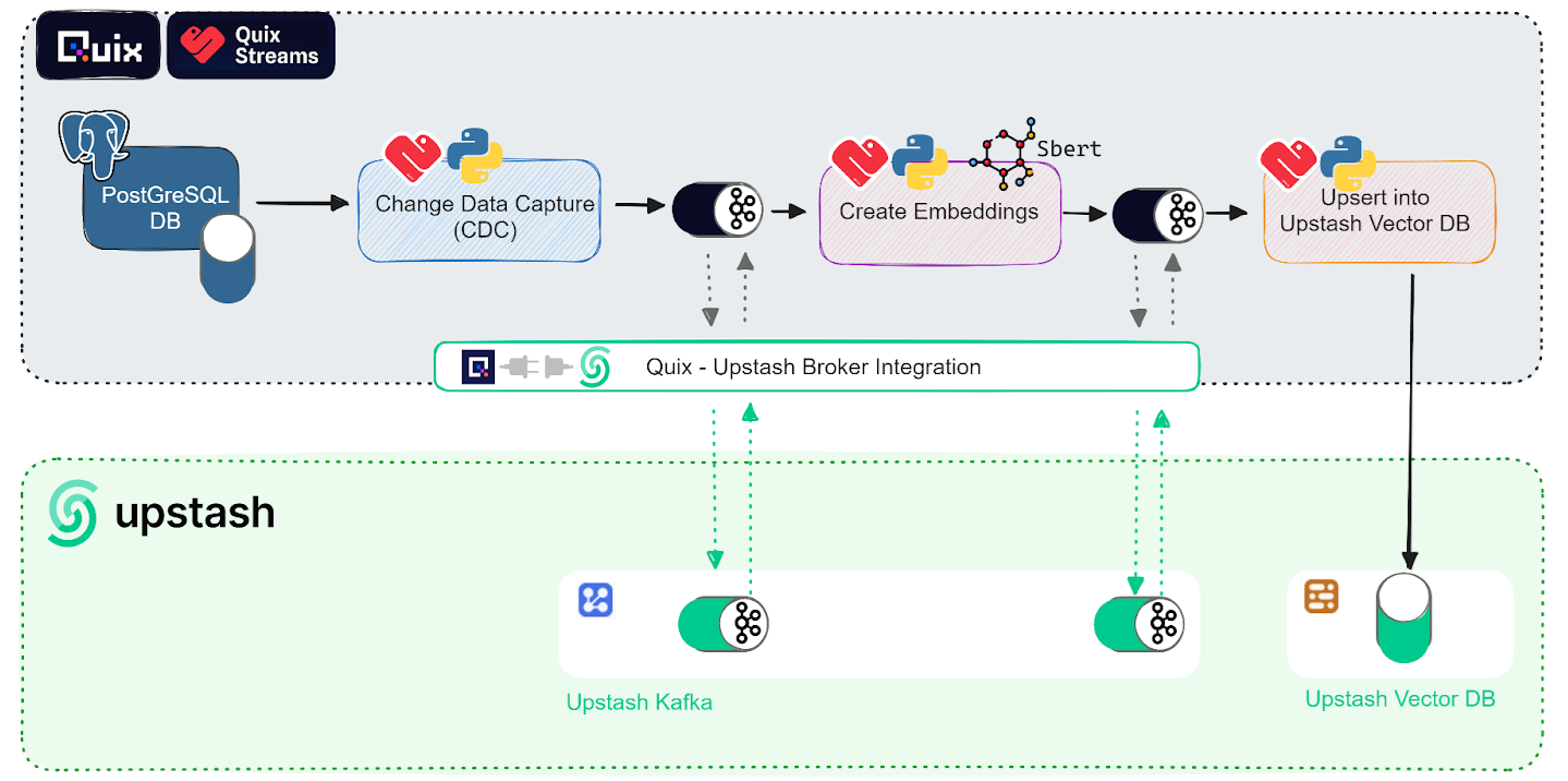 Essentially, you'll be using the Upstash Kafka and Vector database services for data storage and Quix for data processing and Change Data Capture (CDC).