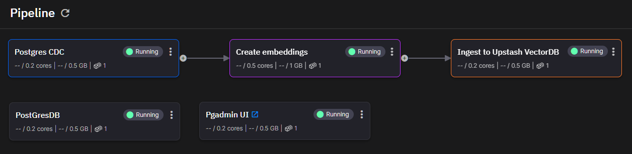 First, let's zoom in on the processing part of our architecture diagram. You can see that there are three services that are small continuously running Python applications: ”CDC”, “Create embeddings”, and “Upsert into Upstash VectorDB”