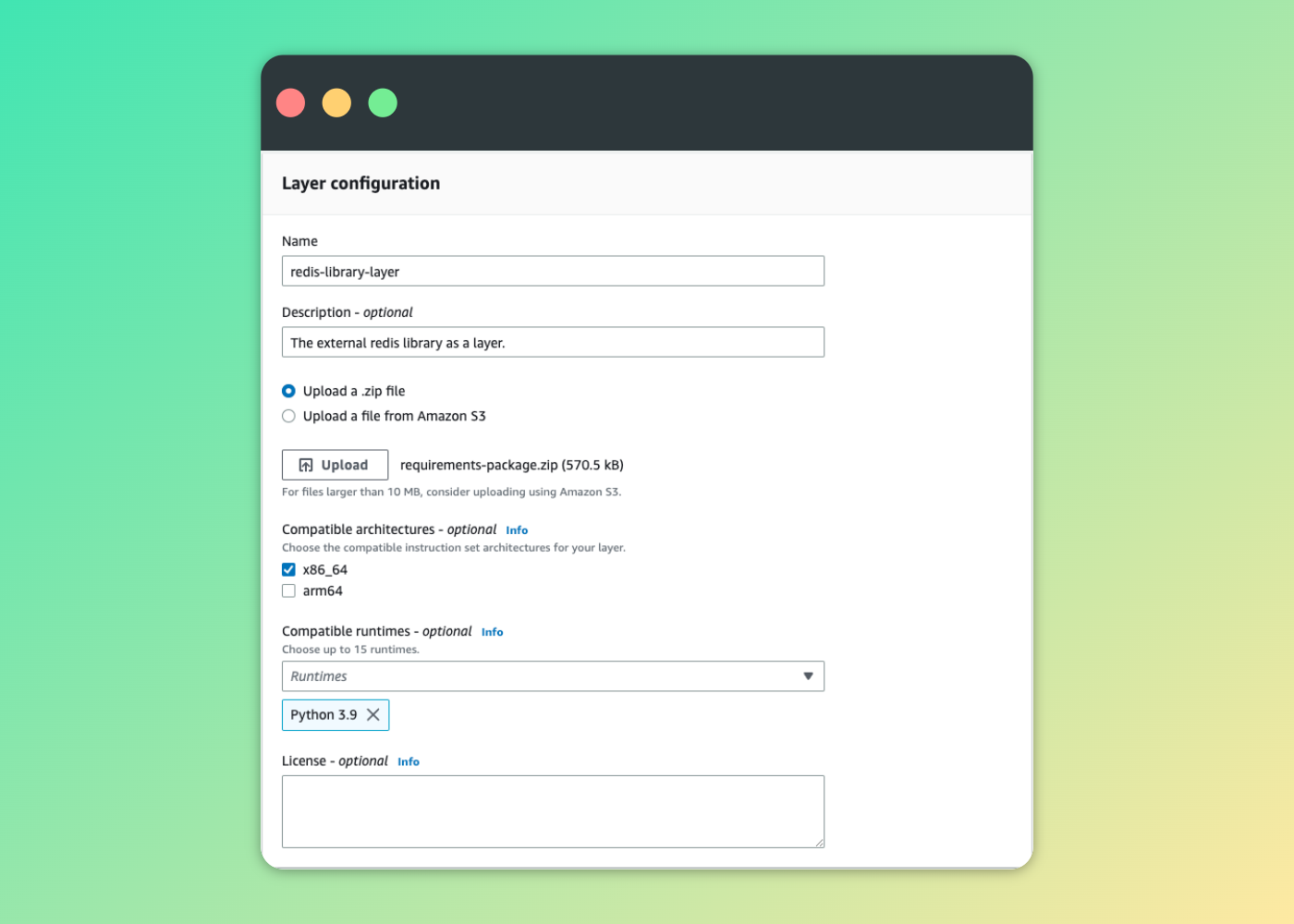 Then, go back to the shortener function on AWS and direct to Layers from the sidebar. Click on the Create layer and fill in the needed configuration and upload the requirements-package.zip file, just similar to mine.