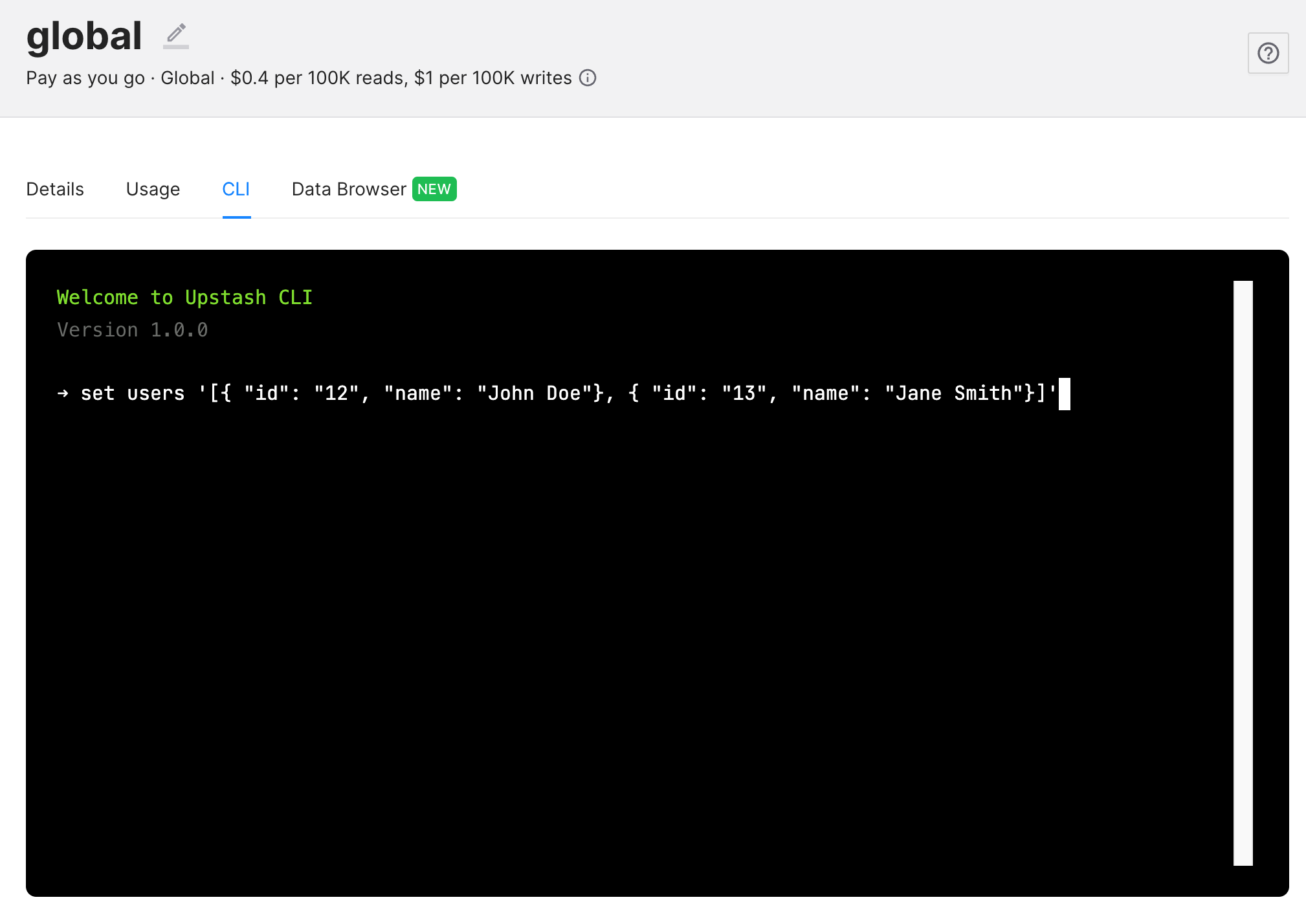 Create a Redis database using Upstash Console. Using the CLI insert users data as below:
